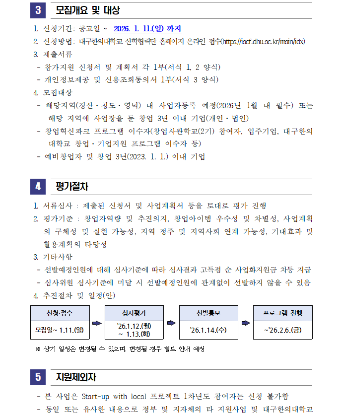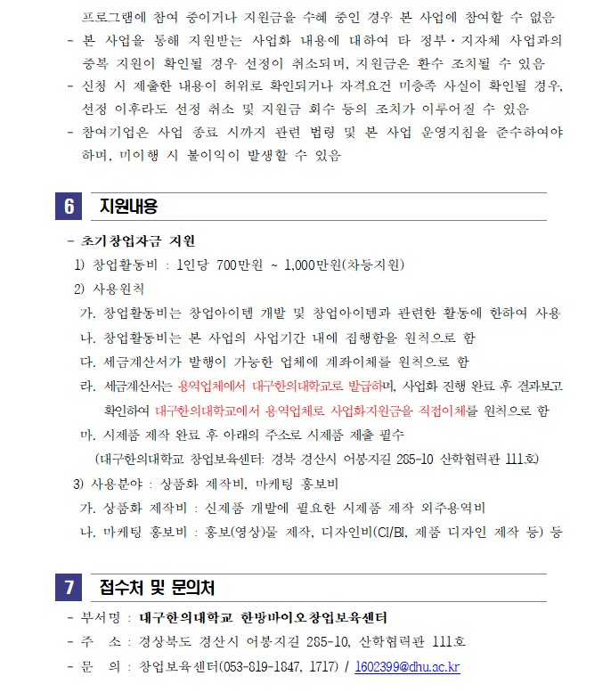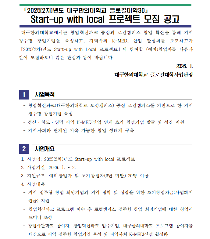 이전으로 2025(2차)년도 글로컬대학30 Start-up with local 프로젝트 모집 공고 지원분야사업화 창업단계 창업(1~3년) 기관명대구한의대학교 한방바이오창업보육센터 접수기간2026.01.06 ~ 2026.01.11 조회수6 붙임_2025(2차)년도 Start-up with Local 프로젝트 참여자 모집 공고문 및 신청서_2026.01.hwp 문의처 E-MAIL : TEL :